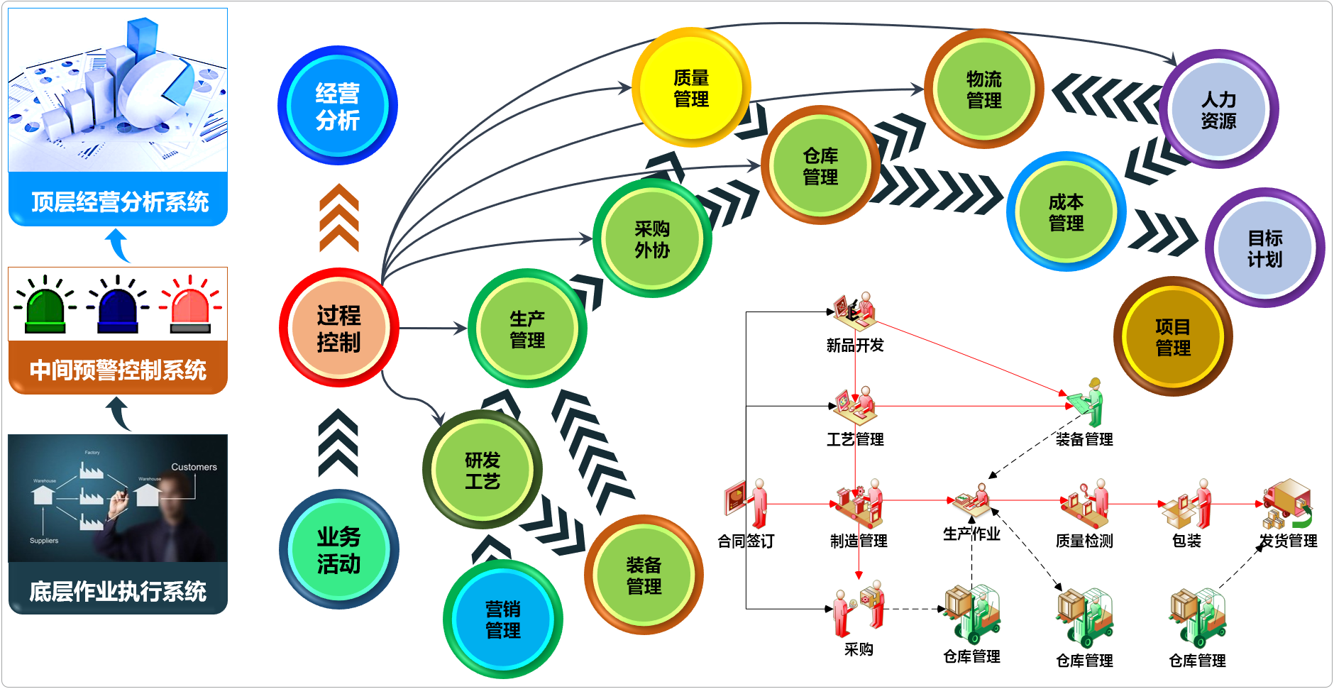 1、底层作业执行系统:囊括了工业企业所有的业务活动运行和控制,销售、研发、工艺、计划、物控、采购、外协、生产、品质、仓库、物