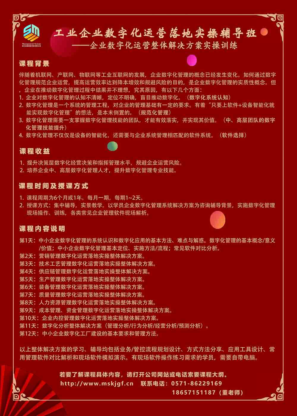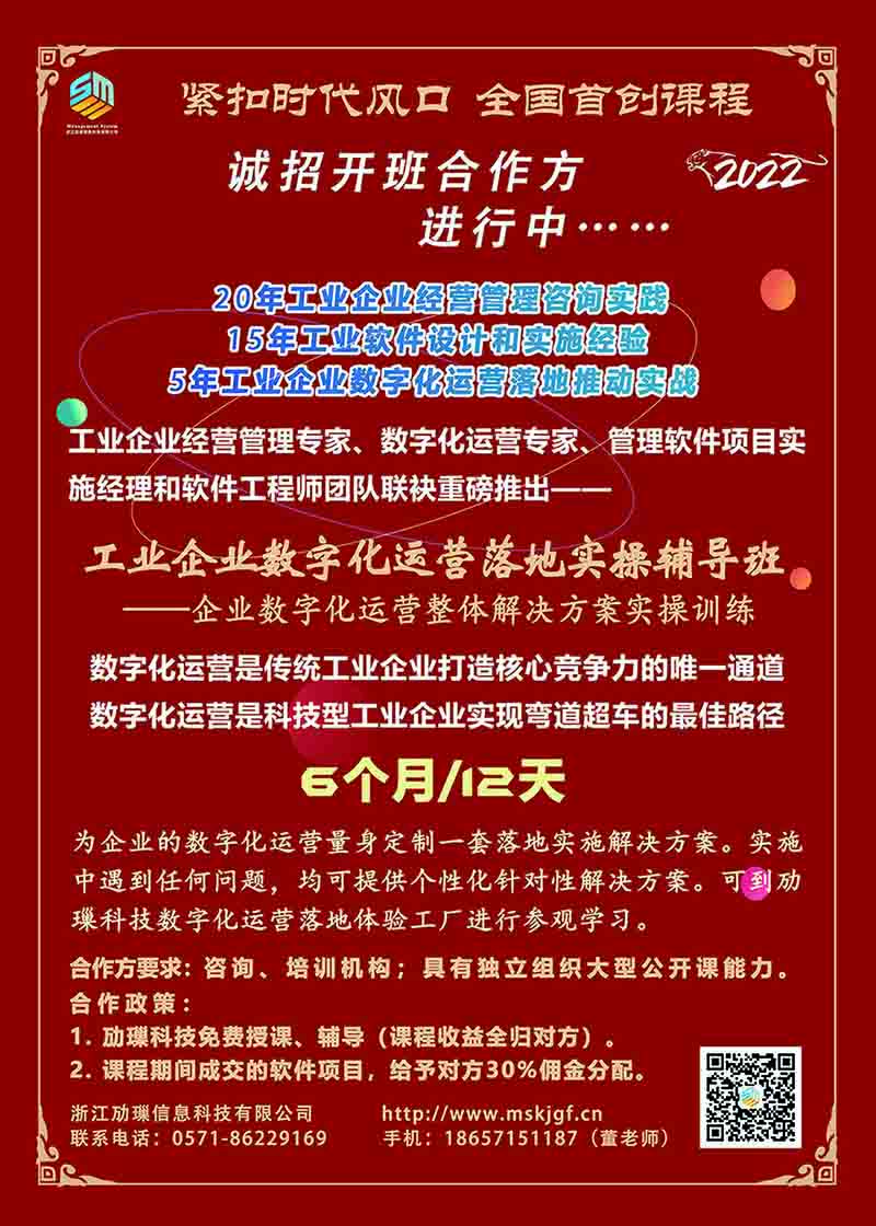 2021年12月,为助力并推动工业企业、传统制造业数字化管理转型和升级,以及数字化管理能力提升,劢璅信息科技于12月份正式面向全国范围内推出数字化管理大型系列咨询班——工业企业数字化管理辅导咨询班。以通过此咨询班的开办为工业企业信息化和数字化发展指明方向,并提供专业、系统的全套数字化管理解决方案辅导服务。