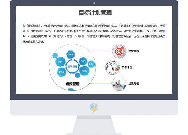 即『绩效管理』。MS目标计划管理模块,囊括动态目标和静态目标两种管理模式,并且具备积分管理的长效激励机制。考核项目可以根据岗位自定义,且静态目标根据MS业务执行模块自动统计数据,动态目标可以根据企业需求自定义。目标(做什么?)的实现离不开计划(如何做?)管理,MS目标计划管理模块将目标与计划管理有效融合,为企业经营目标管理提供了系统的工具和方法。