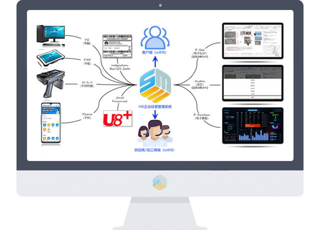 MS经营管理系统打通了工业企业“供应链”,供应商和客户可通过Web端登入系统进行交易互动。同时可以通过多终端进行系统操作、业务办理。MS系统支持全过程条码管理,并可对接目前市面上主流的会计核算系统。