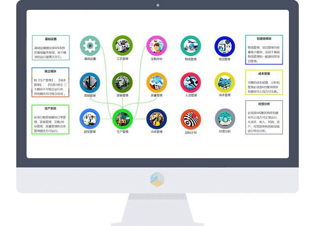 MS系统基于“服务于经营”为目的,囊括了工业企业经营管理活动的所有功能模块。除大生产管理系统不能独立实施外,部分模块可根据企业需求进行“模块化”信息化实施。如: