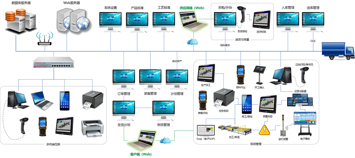 | 生产管理系统 | 产能分析与负荷管理、生产订单管理、主生产计划、生产任务分解、物料需求计划、外协加工需求计划、自动排产/手动排产、生产作业计划、派工/报工管理、生产异常管理、工时与材料消耗管理、生产报表、Andon系统...等。 |