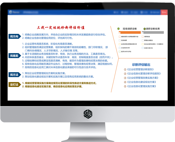 | 售前现场诊断评估 | 基本没有 | 只做生产现场设备自动化状况评估 | 由信息化和管理专家现场对企业经营管理现况进行诊断,并对信息化应用情况进行评估,提交诊断报告和改善建议案,以及信息化实施规划建议 |